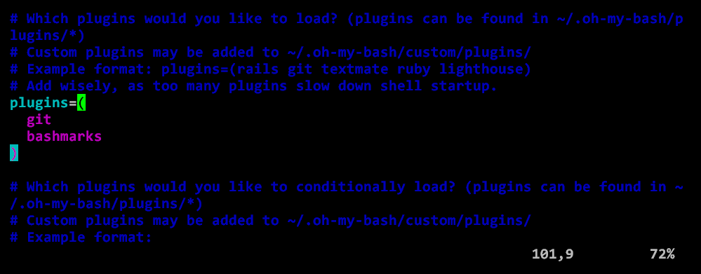 .bashrc를 열어서 추가해 주도록 한다.vi ~/.bashrc101번째 줄에 plugins 구문이 있다.