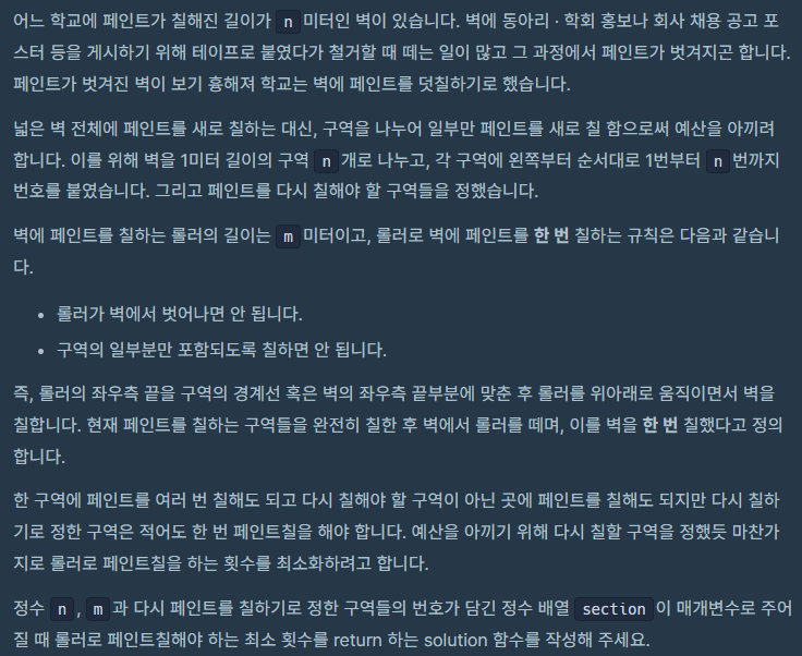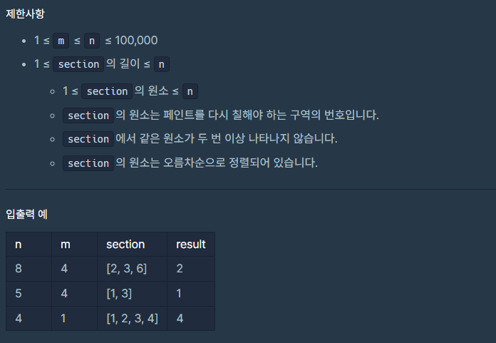 class Solution { public int solution(int n, int m, int[] section) { int maxPainted = 0, cntPaint = 0; for (int point : section) { if (maxPainted <= point) { maxPainted = point + m; cntPaint++; } } return cntPaint; } }내 코드