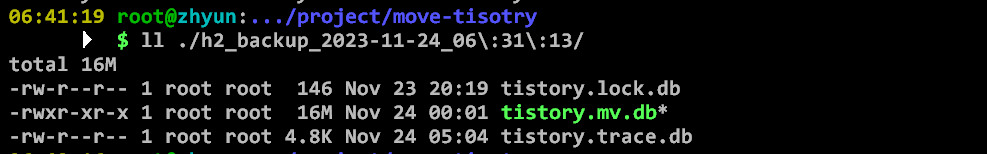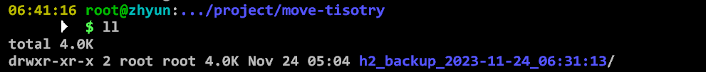 /var/www/project/move-tisotry/위치에 이름 변경 후 저장docker cp move-tistory:/_h2 /var/www/project/move-tisotry/h2_backup_$(date +"%Y-%m-%d_%H:%M:%S")실행 확인