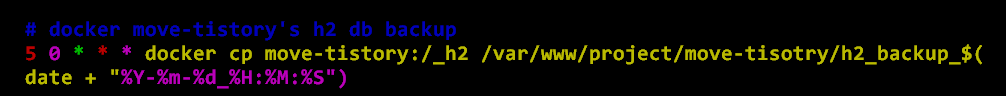 crontab -e5 0 * * * docker cp move-tistory:/_h2 /var/www/project/move-tisotry/h2_backup_$(date +"%Y-%m-%d_%H:%M:%S")