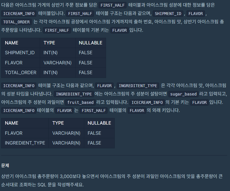 SELECT fh.FLAVOR as FLAVOR FROM FIRST_HALF fh LEFT JOIN ICECREAM_INFO ii ON fh.FLAVOR = ii.FLAVOR WHERE fh.TOTAL_ORDER > 3000 AND ii.INGREDIENT_TYPE = "fruit_based" ORDER BY fh.TOTAL_ORDER DESC'DB > MySQL' 카테고리의 다른 글